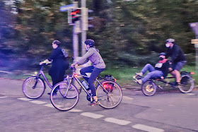 Mit 13 Grad war es schon fast frühlingshaft. Die Sonne wärmte auch schon. Ideales Radelwetter. Doch leider nur bis zum Nachmittag. Regen setzte ein, mal leichter, mal stärker. 18 Uhr rückte näher. Werden wir wieder Glück mit dem Wetter haben? Als ich zum Kronenplatz radelte, musste ich das Regencape doch anziehen. Es regnete mir unangenehm ins Gesicht. Ehrlich gesagt, ich rechnete nicht damit, dass wir die Verbandsgröße von 16 Radlern erreichen. Polizei-Eskorte hatten wir heute eh nicht, einen Tag vor Silvester hatten sie dafür kein Personal. Die Organisation, die Absicherung lag heute in unserer Verantwortung. Ich radelte über die Brücke ... und war überrascht. Der Kronenplatz war nicht leer. Der Regen hatte zugenommen, der harte Kern war da, das zu sagen wäre untertrieben. Über 50 war meine erste Einschätzung. Die Velomobile in ihren verschiedenen Ausführungen waren mit ihren Überdachungen klar im Vorteil. Nur ein Polizeimotorrad für alle Fälle. Und ein Privatauto, um den Zug nach hinten abzusichern. Und dann unsere vielen Ordner. Rasch mussten noch weitere rekrutiert werden. Um die 100 Fahrräder waren am Start. Und wohlgemerkt, das Wetter besserte sich nicht.