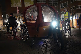 18:30 ist es endlich soweit, wir starten. 176 sind wir heute, wie ich später zähle. Das mit dem Zählen ist gar nicht so einfach heute. Die Strecke nach Durlach und dann über Killisfeld wieder zurück ist eine Schnellfahrstrecke. Und alle wollen warm werden, entsprechend schnell wird geradelt. Ich muss schauen, dass ich immer schnell trotzdem alle überhole, und weiter vorne einen Platz zu Zählen zu finden. Die kritischen Stellen, wie die Autobahnzufahrten werden ruckzuck durch Ordner und Polizei gesichert, es geht wie am Schnürchen. Wo es im Normalbetrieb hapert, bekommt man so gar nicht mit. Dafür genießen alle das flotte vorwärtskommen, ja, so schön kann Fahrradfahren zwischen Karlsruhe und seiner Mutter Durlach sein. Dazu tönt aus der Musikbox "Ich brauch kein Auto, ...".